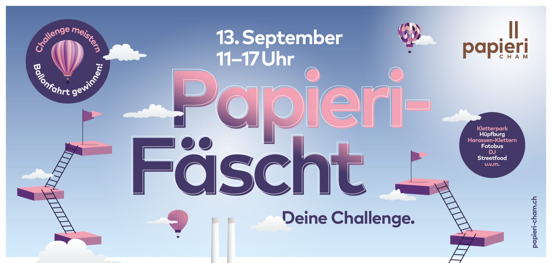 Das fünfte Papieri-Fest findet am Samstag, 19. September 2026 auf dem Papieri-Areal in Cham bei Zug statt. Das Festprogramm beginnt um 11.00 Uhr und endet um 17.00 Uhr. Auf dem gesamten Papieri-Areal erwarten Sie Foodtrucks und Barbetrieb, Musik und ein abwechslungsreiches Kinderprogramm.